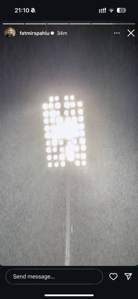 Spahiu ka publikuar një video të shkurtër nga stadiumi, ku shihen qartë reshjet e mëdha të shiut që kanë përfshirë vendin, duke treguar atmosferën e veçantë dhe sfidat që po përballin tifozët.