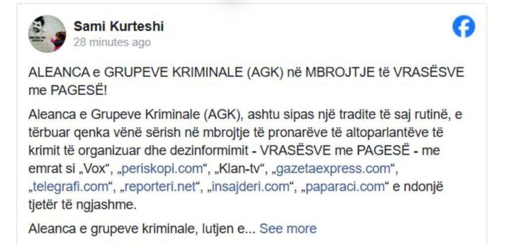 Kurteshi sulmoi edhe Asociacionin e Gazetarëve të Kosovës (AGK), që doli në mbrojtje të gazetarëve nga sulmet e Kurteshit.